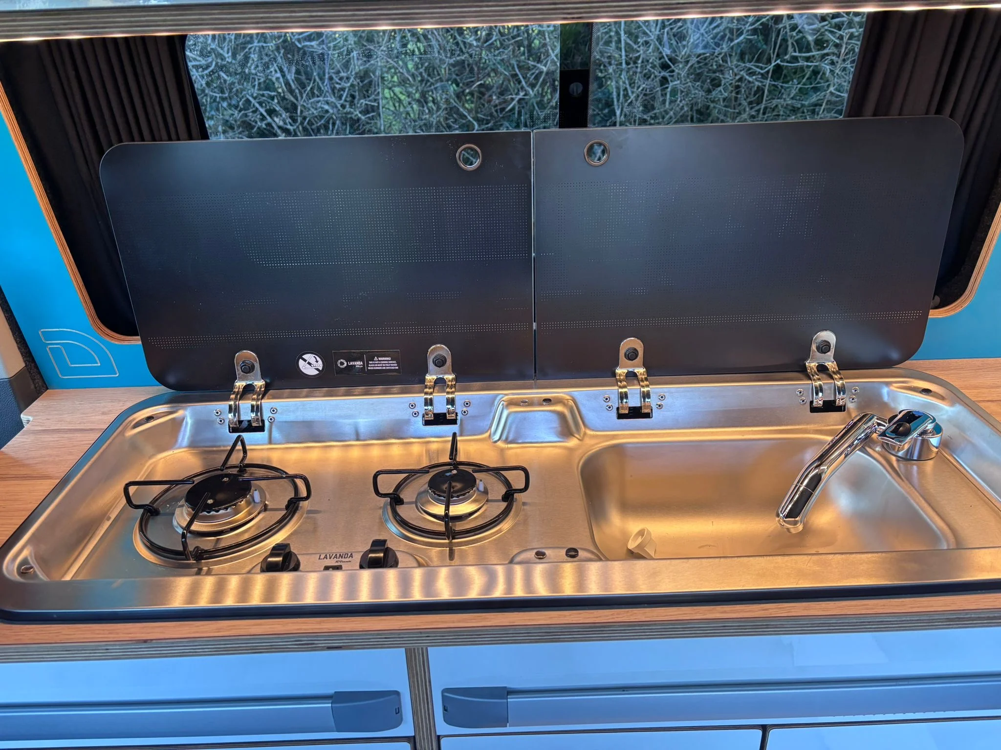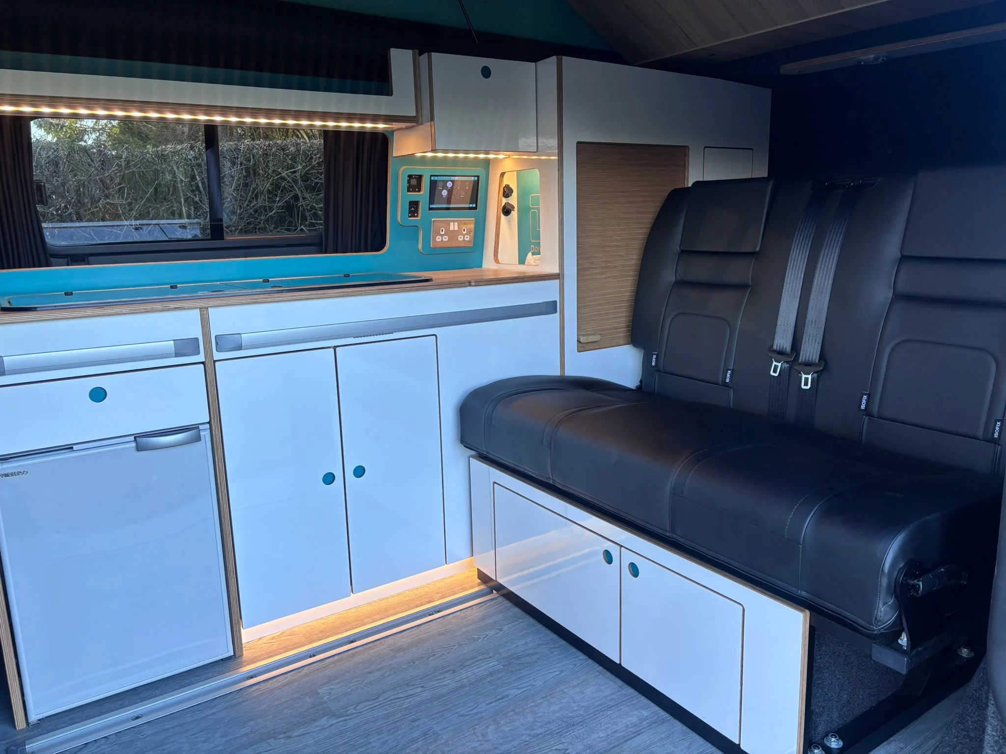 The Dormobile Ford Transit Custom rip-tide Camper combines style, comfort, and practicality in one versatile van. Built on the Ford Transit Custom Limited, it delivers a smooth, confident drive for every trip. Inside, the flexible layout adapts easily, with a bright living space by day and sleeping for up to four at night. Two rear seats and a swivel seats create a welcoming dining area. A fitted kitchen includes a double hob, sink, and fridge freezer. Sleeping arrangements feature a spacious main 112 rib bed and a pop-top roof with an additional double.